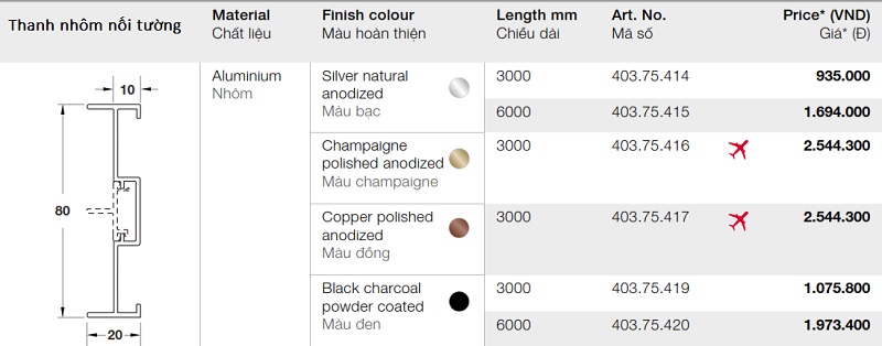 Bảng mã thanh nhôm nối tường SLIDO ALUFLEX 80 Hafele