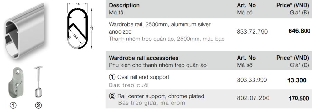 Mua thêm bas & led dây cho Thanh treo quần áo 2,5 mét oval nhôm có rãnh gắn led Hafele 833.72.790