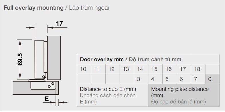 Thông số lắp đặt bản lề Metalla A 110 độ trùm ngoài Hafele 493.03.021