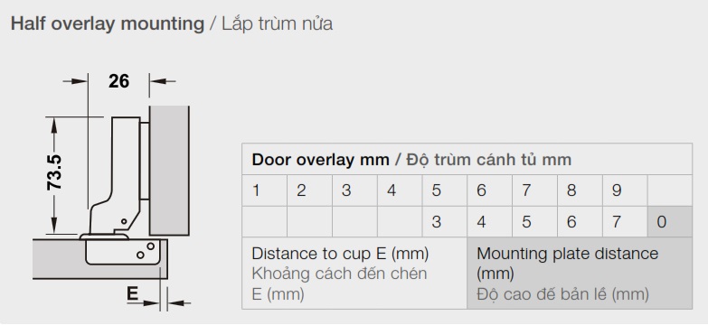 Thông số lắp đặt bản lề Metalla A 110 độ trùm nửa Hafele 493.03.024