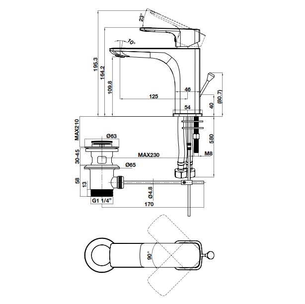 Kích thước vòi Lavabo Kobe 100 chrome có bộ xả kéo hafele 589.15.001