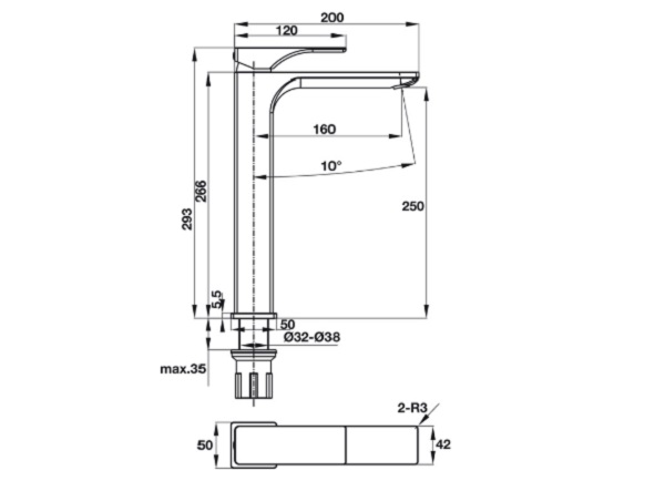 • Khoảng cách từ đầu vòi đến chậu / mặt bàn: 250mm